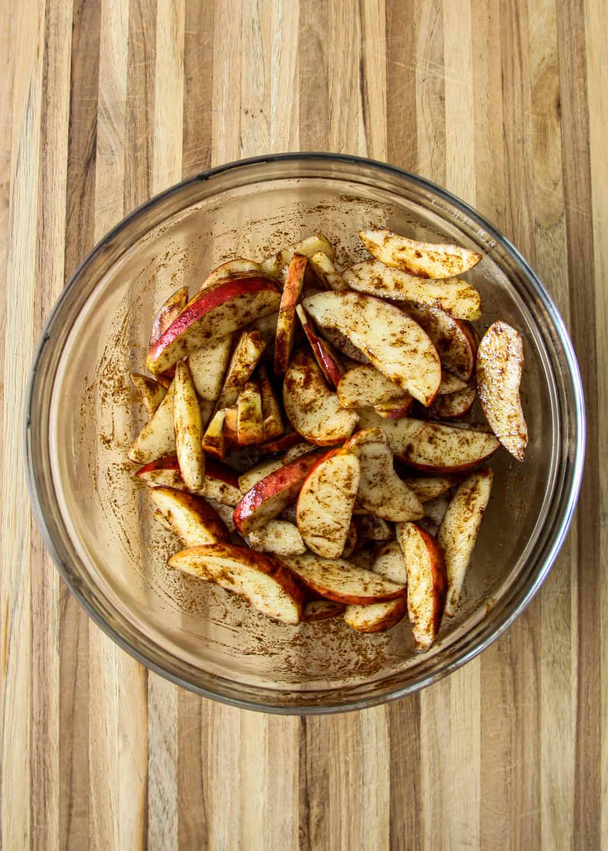 - Add the apple slices and stir or toss to coat all the slices in the cinnamon mixture.