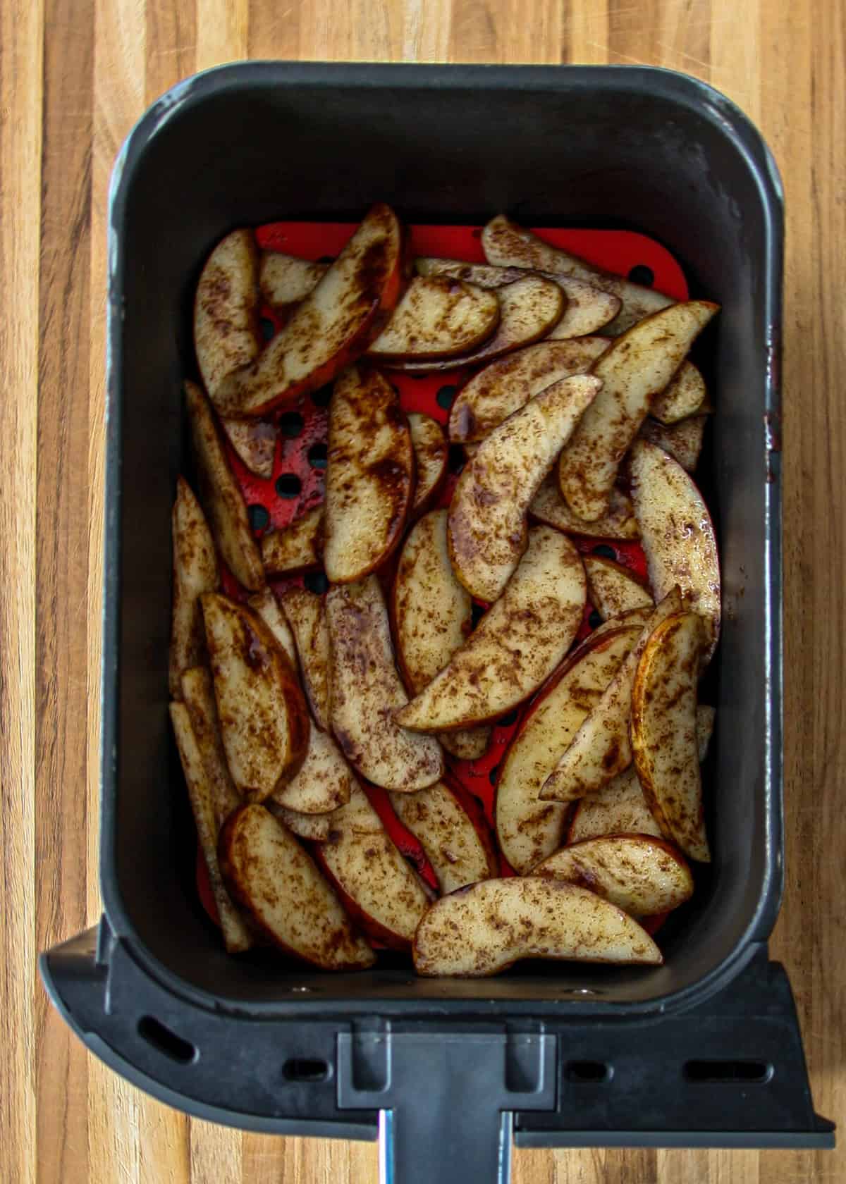 - Don't overcook. For best results, air fryer cinnamon apples should be tender, but still have a bit of a bite. To avoid over-cooking, check them a couple of times during the last half of cooking. Since air fryers vary widely, the cooking time here is a guideline.