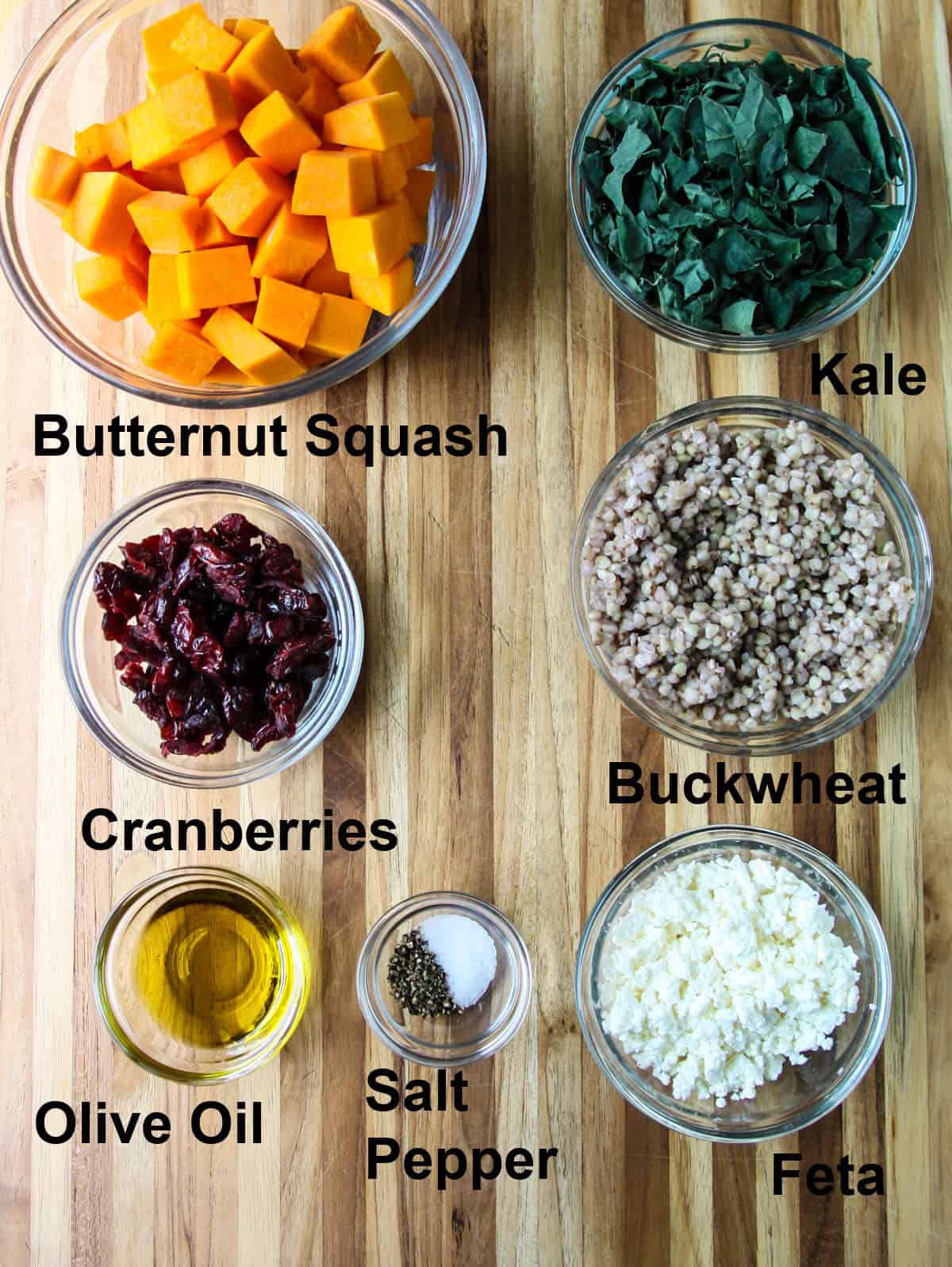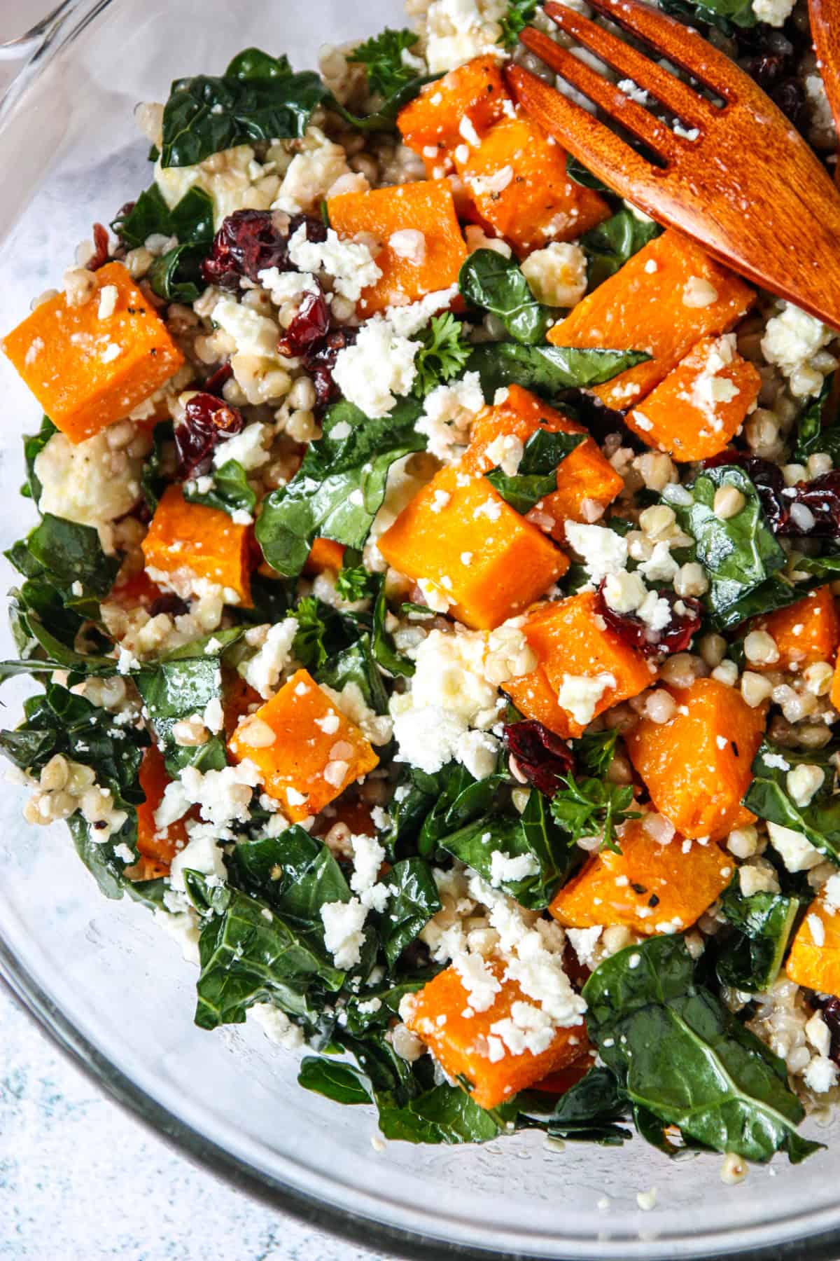 - Add the cooled butternut squash, cooked buckwheat, kale, cranberries, and feta cheese. Toss gently to combine.