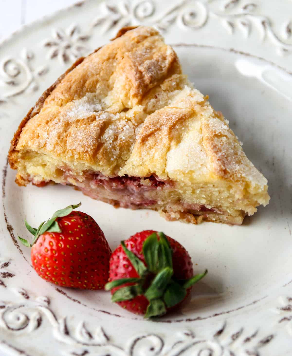 French strawberry cake is a delicious dessert cake with a custard-like center and a sugary, crackled crust. It's brimming with juicy strawberries and best of all, it only takes 10 minutes to mix up.