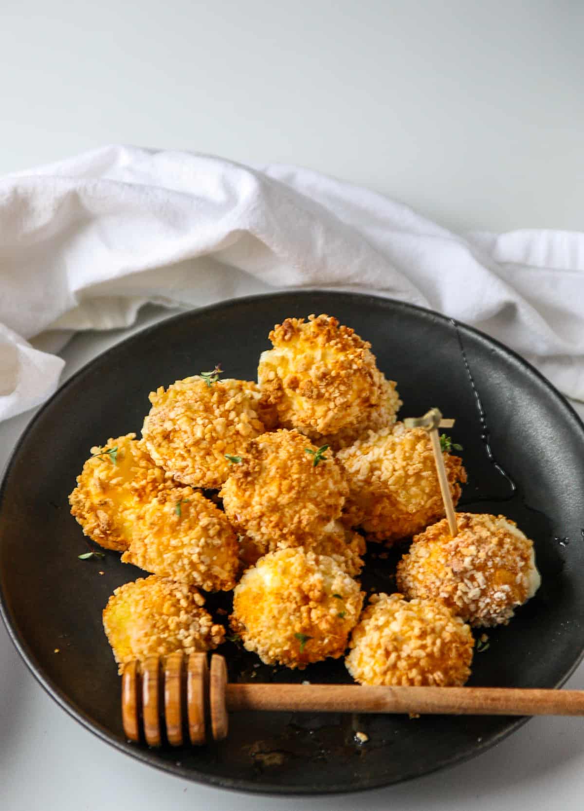 - Remove the fried goat cheese balls to a serving plate. Drizzle with honey and garnish with thyme. Serve right away.