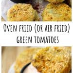 Traditionally, these green tomatoes are fried in oil on the stovetop. But, just like with these Baked Zucchini Fritters, or these Gluten-Free Buffalo Cauliflower Bites you can achieve a crisp and satisfying result in a hot oven or air fryer. Eliminating the mess of frying in oil, along with all the extra calories and fat.